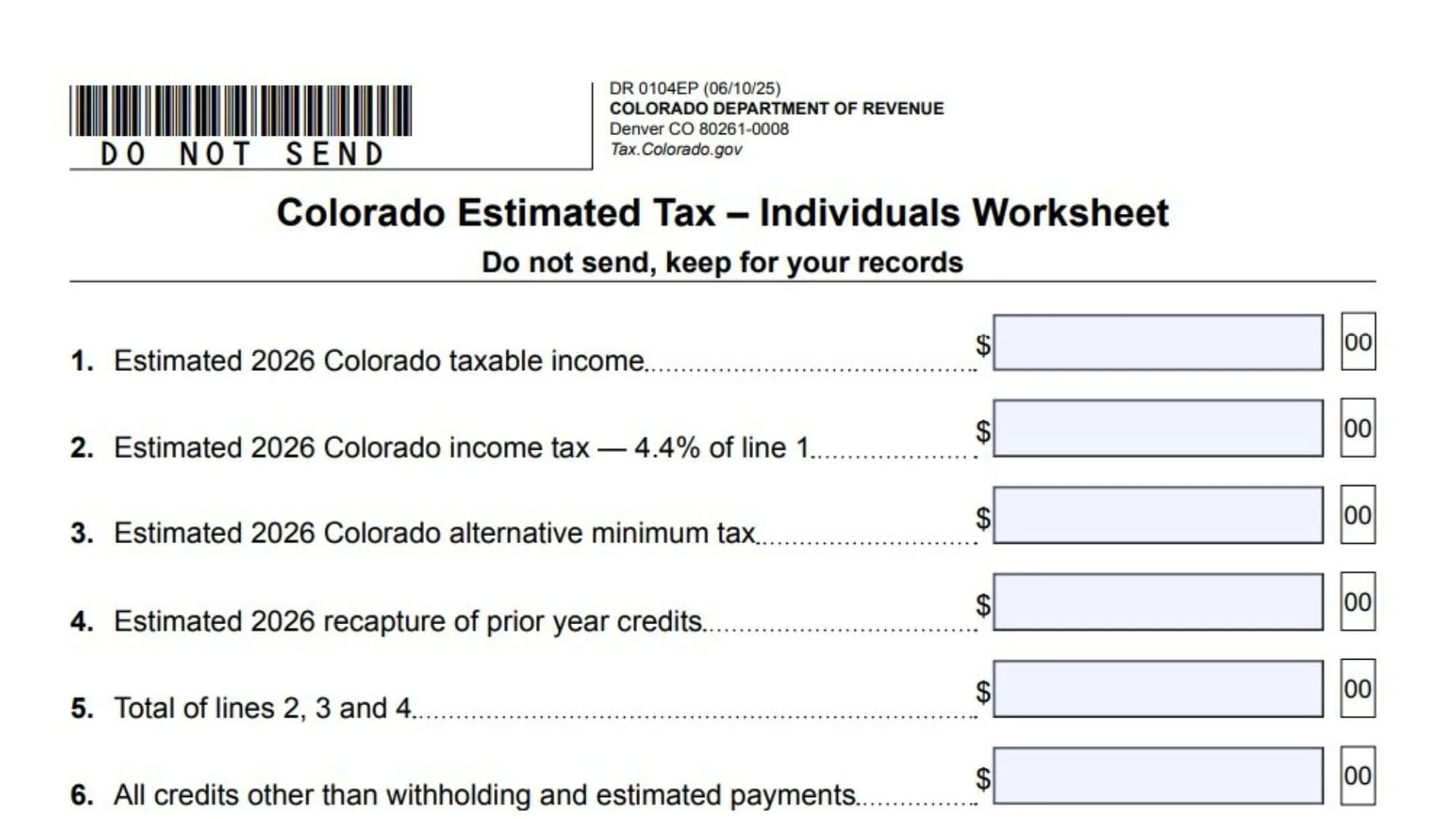 The Colorado Individual Estimated Income Tax Payment Form DR0104EP is a specific tax document designed for individuals who need to pay taxes on income that is not subject to standard withholding, such as earnings from self-employment, interest, dividends, or rental properties. While traditional employee wages typically have taxes deducted automatically, other forms of income do not, meaning you may be required to make these estimated payments if your withholdings are insufficient to cover your liability. According to the general rule outlined in the instructions, you generally must make these payments if you expect to owe more than $1,000 in net tax for the 2026 tax year after subtracting any other withholding or credits you might have. Failing to remit these payments on time can result in an Estimated Tax Penalty, although exceptions exist for farmers and fishermen who pay in full by March 1. It is important to note that these payments are strictly for prepayment credit on your upcoming return and cannot be refunded until the full 2026 Colorado income tax return is filed.