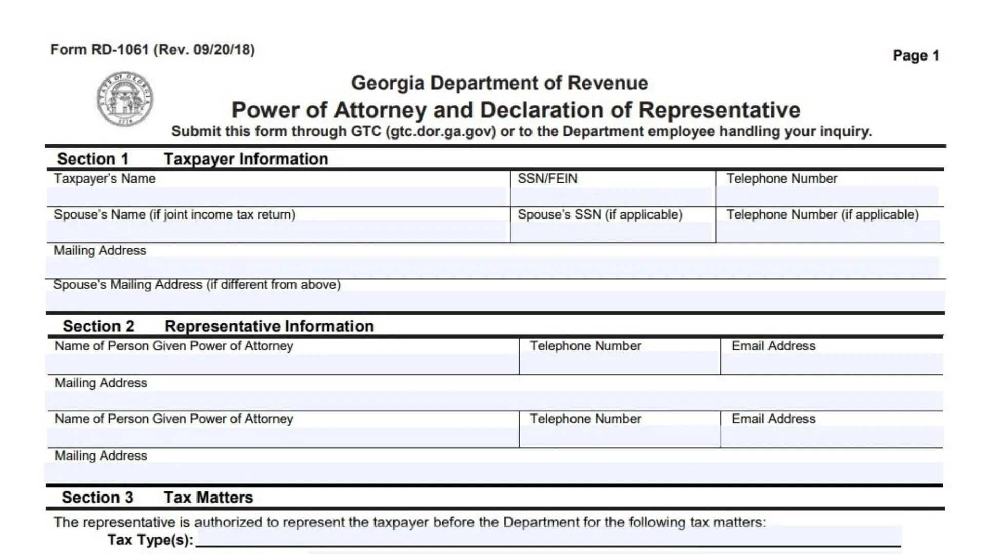 The Georgia Form RD-1061 is a formal legal document utilized by taxpayers to authorize an individual or multiple individuals to represent them before the Georgia Department of Revenue. This authorization allows the appointed representative to discuss confidential tax matters, access sensitive information, and perform specific acts on behalf of the taxpayer for designated tax periods. Taxpayers can use this form to grant permission for a professional, such as a certified public accountant or an attorney, to handle tasks like making payments, executing waivers, filing protests, or receiving refund checks. It acts as a necessary safeguard, ensuring that the state only communicates private tax details to explicitly trusted agents while the taxpayer maintains ultimate responsibility for their tax obligations. The document is strictly limited to the specific tax types and years outlined within it and automatically revokes prior authorizations unless you indicate otherwise.